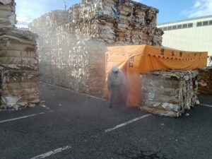 訓練用の煙が充満したテントの中を歩いて出口まで向かいますが、前方が全く見えず、落ち着いて行動することが大切だと実感しました!