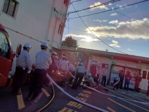 今回の消防訓練は、避難訓練・担架による救助訓練・消防(119)への通報訓練・消火器の取り扱い訓練・ポンプ車などによる放水訓練