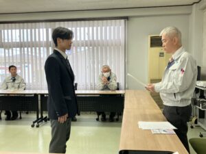 入社式では、少し緊張した様子もありましたが、ハキハキと受け答えをしている姿がとても印象的で、社会人としての第一歩をしっかり踏み出しているなと感じました。